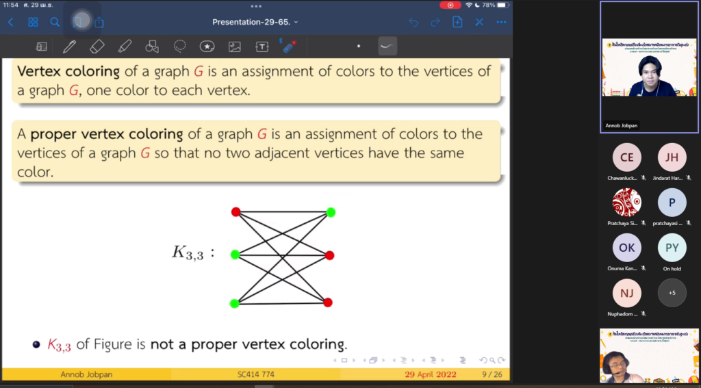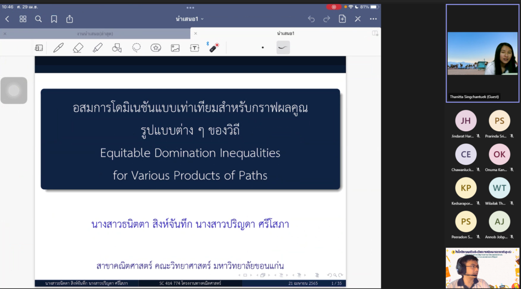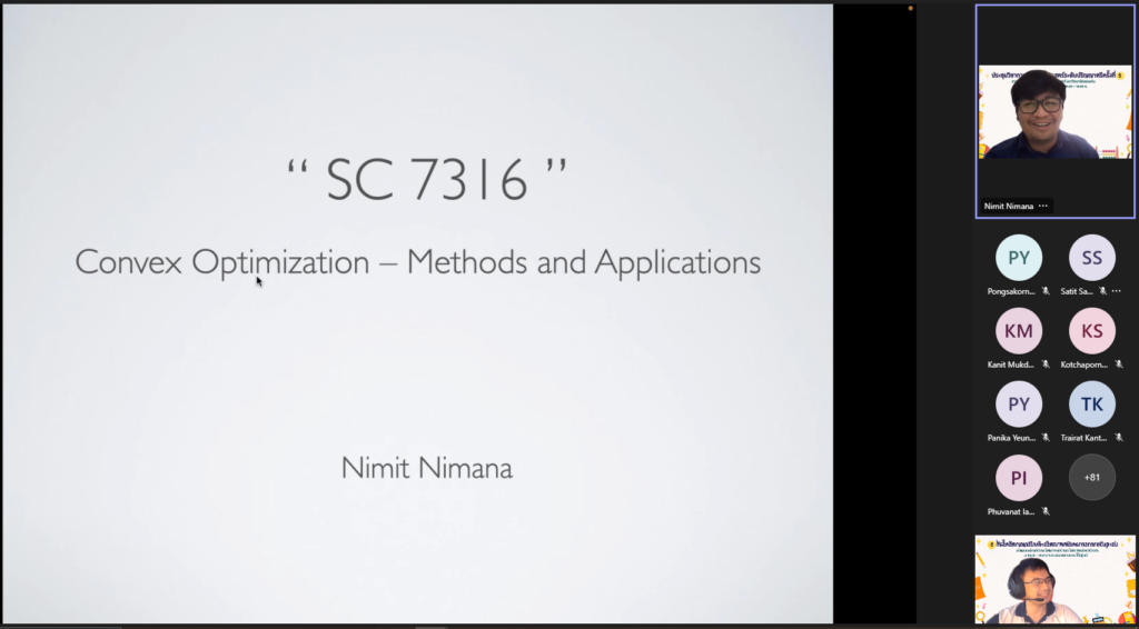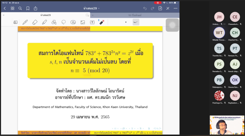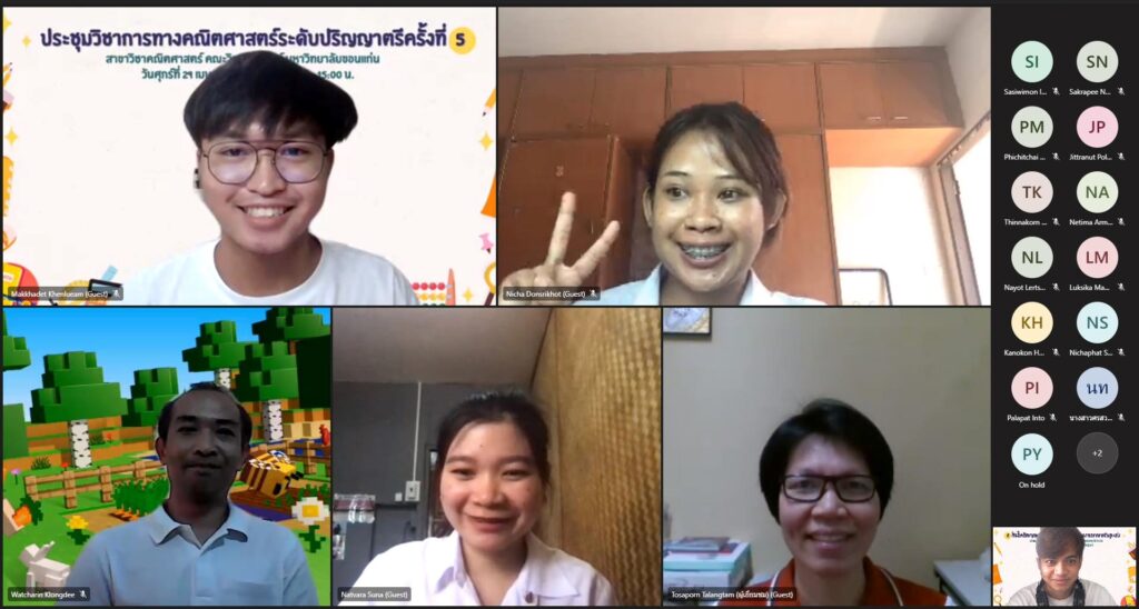 สาขาวิชาคณิตศาสตร์ คณะวิทยาศาสตร์ มหาวิทยาลัยขอนแก่น จัดการประชุมวิชาการทางคณิตศาสตร์ ระดับปริญญาตรี ครั้งที่ 5 ประจำปีการศึกษา 2564 วันที่ 29 เมษายน 2565 เวลา 9:00 – 15:00 น. ในรูปแบบออนไลน์ ผ่านทาง Microsoft Teams เพื่อเปิดโอกาสให้นักศึกษาได้มีประสบการณ์การนำเสนอผลงานทางวิชาการ โดยมีการบรรยายพิเศษจาก อาจารย์ในคณะวิทยาศาสตร์ จำนวน 4 ท่าน ได้แก่