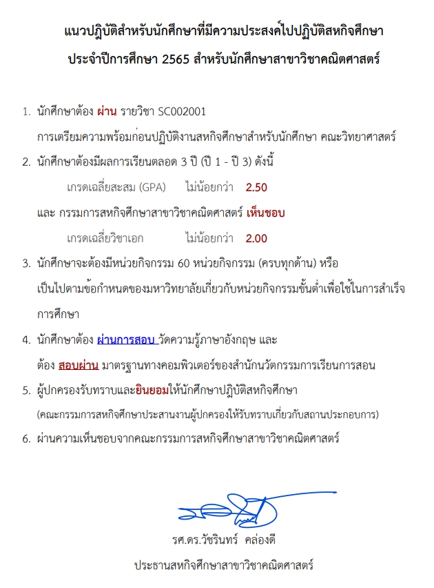 ประจำปีการศึกษา 2565 สำหรับนักศึกษาสาขาวิชาคณิตศาสตร