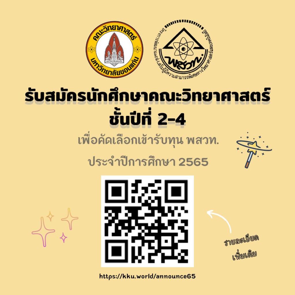 📣📣📣 คณะวิทยาศาสตร์ มหาวิทยาลัยขอนแก่น 🔸 รับสมัครนักศึกษาชั้นปีที่ 2-4 เพื่อคัดเลือกเข้ารับทุน พสวท. ประจำปีการศึกษา 2565 🔹 สามารถสแกน QR code ด้านล่าง เพื่อศึกษารายละเอียดเพิ่มเติม 👇👇👇👇