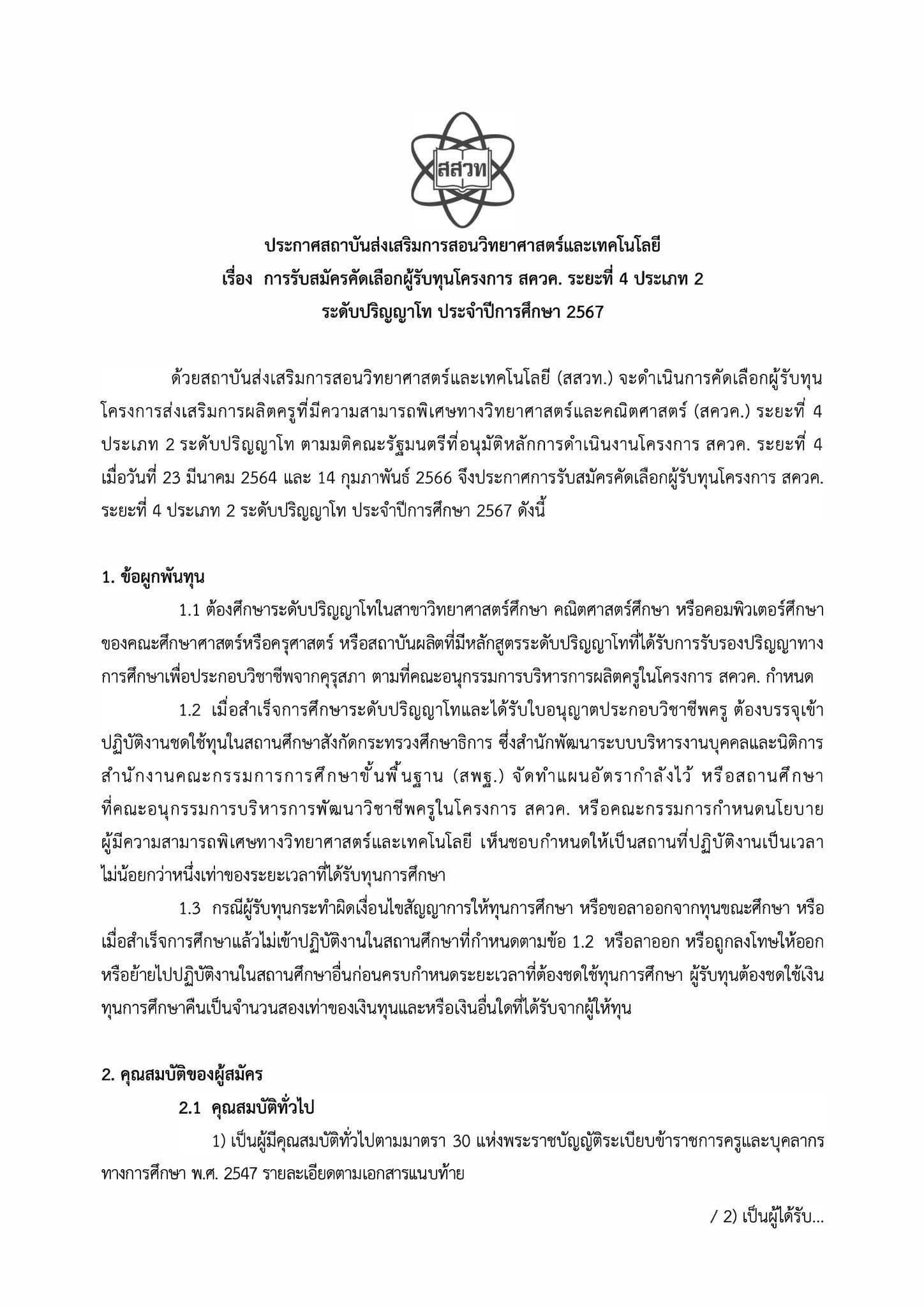 ประชาสัมพันธ์การรับสมัครทุน สควค.